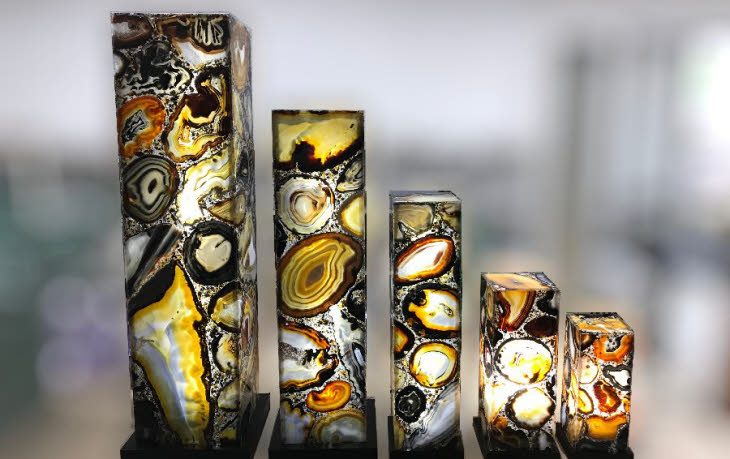 Diese wunderschönen Achatlampen sind allesamt exklusive Einzelstücke und in verschiedener Grössen erhältlich. Diese Achat Lampen werden aus Natur Achat gefertigt. Grosse Achatgeoden werden in feine Scheiben geschnitten und auf einem speziellen dafür angefertigten Tisch ausgebreitet und mit einem Harz zusammengeklebt. Danach wird die Platte mit einer Schleifmaschine "Plan" geschliffen. Nun werden die benötigten vier Streifen aus der Platte mit einer Gehrungssäge ausgeschnitten und so wieder zusammengebaut. Dadurch sind die Achatscheiben "sogenannt um die Ecke" wieder zu sehen. Also eine wahre Kunstarbeit.